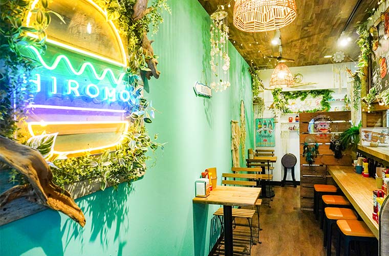 「外で自然を感じながら味わうような感覚を、店内でも楽しんでほしい」との思いから、店のテーマは“カリフォルニアの海沿いカフェ”。同店のイメージカラーである爽やかなターコイズブルーの壁に、グリーンのあしらいやマクラメの壁飾りなどを配し、ボタニカルな雰囲気が訪れる人を迎えます。