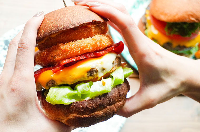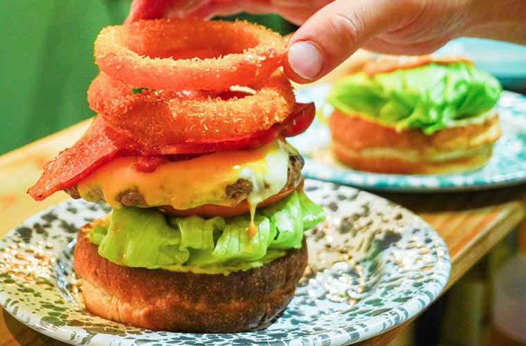 パティとベーコンの肉×肉コンビに、オニオンリング2個とモッツァレラ、チェダーチーズをプラスした、豪快なハンバーガーもおすすめ。定番4種のソースに自家製BBQソースが加わることで、ハンバーガー全体に一体感が生まれ、思わず背徳感を覚えるようなおいしさに仕上がっています。テーブルに運ばれてきた瞬間、思わず息をのむほどのボリュームに圧倒されますが、気付けばそのおいしさに、あっという間に平らげてしまいます。