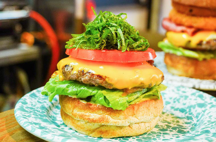 人気No.1の『シソチーズバーガー』は、店主が一から考案した、ここでしか味わえないオリジナルバーガー。ジューシーなパティにハニーレモンソースを重ね、仕上げにシソをたっぷりとのせた個性あふれる一品です。シソの爽やかな香りと、ハニーレモンの甘酸っぱさが意外にも好相性。一度食べるとやみつきになる、魅惑のバーガーです。
