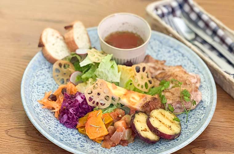 おしゃれなイタリアンバルとして知られる同店で、特に人気を集めているのが『本日の切り株プレートランチ』。10種類の彩り豊かな料理には、自社農場「あるこファーム」で育てた旬の新鮮野菜を使用していて、素材のおいしさを存分に味わえます。塩麹(こうじ)やタマネギ麹など、数種類の自家製麹調味料を使い分け、体に優しいうま味が口の中にじんわりと広がります。