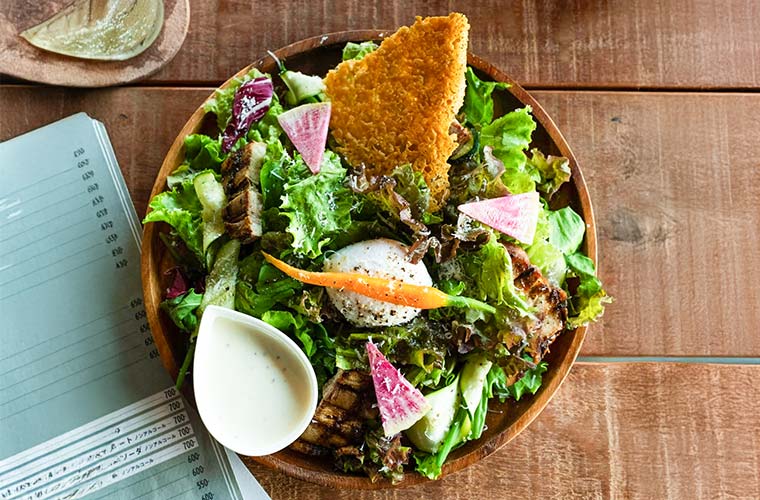 女性や健康思考の人にも人気のある『自家製ベーコンのシーザーサラダプレート』は、地元野菜をブーケのように美しく盛り付けた彩り豊かなサラダに、スープとパン、ドリンクが付きます。サラダの中央を飾る温泉卵を割り、自家製のシーザードレッシングを絡めれば、わっと驚くほど濃厚な味わい。野菜だけとは思えないほどの食べ応えもあります。