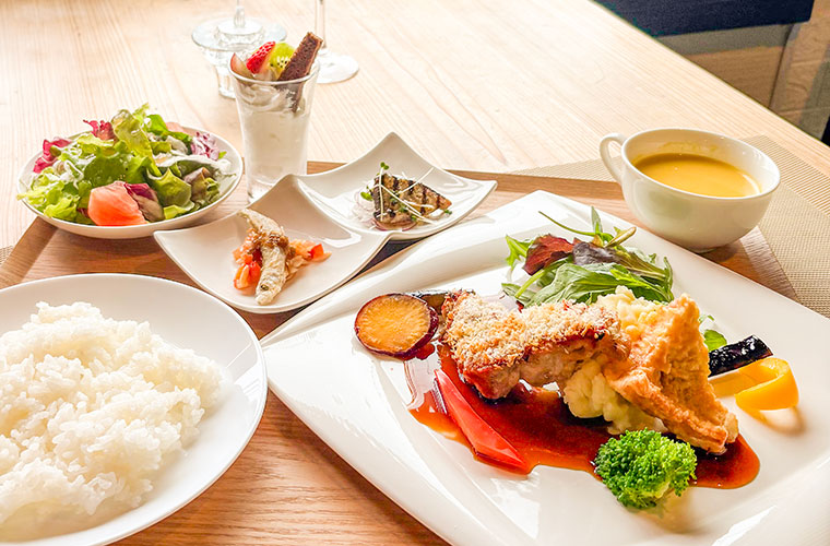 月2回内容が替わるメイン料理に、ミニオードブル、カップスープ、サラダ、ライス、ミニデザートが付いた満足度抜群の『おすすめランチ』。国産肉を使ったメイン料理と、みずみずしい旬野菜をふんだんに使った彩り豊かな一皿一皿が、テーブルを華やかに彩ります。