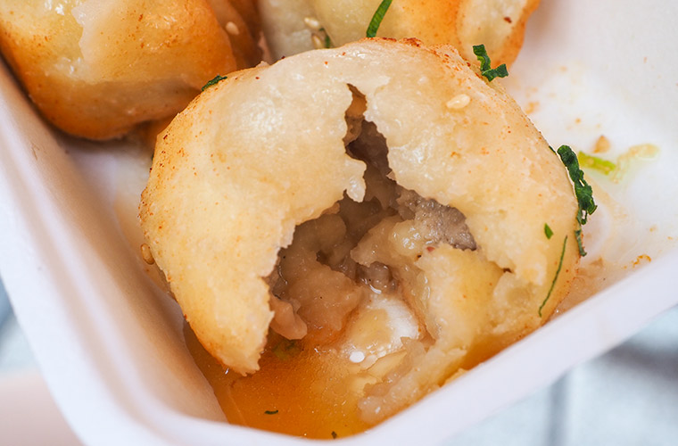 色鮮やかな真っ赤なテントに自慢のメニューがずらりを並ぶ「朋榮(ホウエイ)」。自分用におすすめの1個売りからお土産用のセット売りまで豊富にそろいます。常にできたてを包んでくれるのがうれしいポイントです。