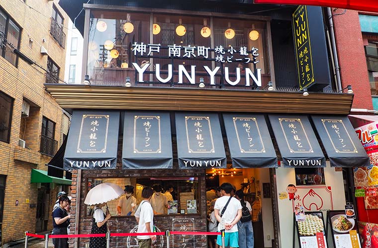 南京町の中でも中心部にある広場からやや東へ進むと、南京町らしい色鮮やかな店舗が軒を連ねる中、黒で統一された外観で一際目立つ「YUNYUN(ユンユン)」があります。神戸で1950年に創業したビーフンメーカー「ケンミン食品株式会社」が運営しています。