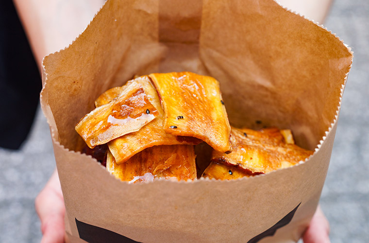 同店で一番人気の『切揚(きりあげ)』。薄くスライスしたサツマイモを、高温でパリパリに素揚げし、優しい甘さに仕上げ、自家製の蜜を絡めた一品。手軽に食べられるので一枚食べたら手が止まらなるほど病(や)みつきに!大サイズは少人数でシェアしたい人におすすめ♪このほか、1人で食べるなら『切揚(小)』(500円)や、大人数でシェアしたい人は『切揚(特大)』(1,200円)も販売しています。