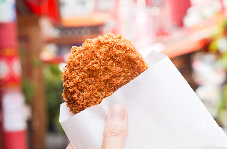 毎朝工場から届く作りたての生コロッケを店頭で一つひとつ丁寧に揚げているので、衣はサクサク、中はホクホクの仕上がり。うま味たっぷりの牛肉とジャガイモの素朴な甘みとの絶妙なバランスを楽しめます。