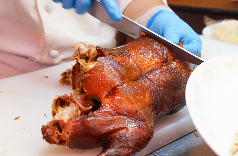 「華鳳(かほう)」は、高級中華として知られる北京ダックの専門店。店先ではアヒルがぐるぐると回転しながら焼かれていて、思わず足を止めて見入ってしまうほどの迫力です。