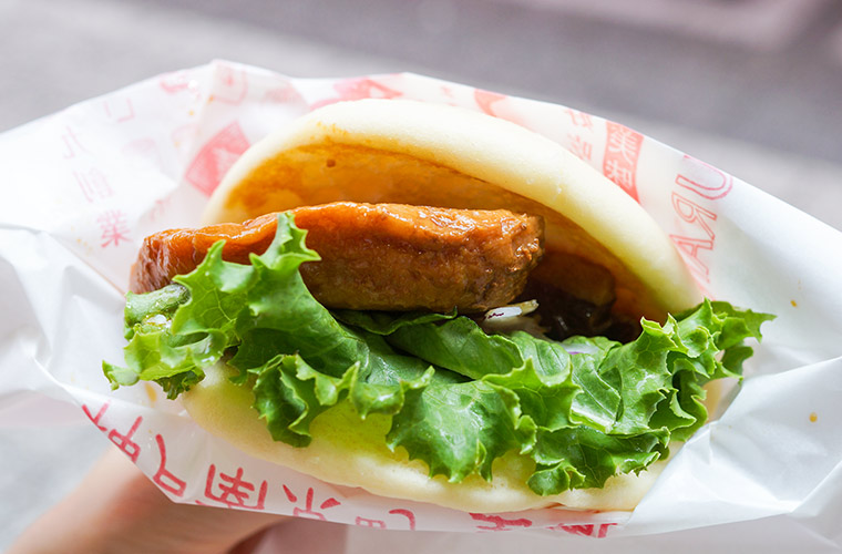 『角煮バーガー』は同店の名物メニュー!メディアで多数取り上げられたイチオシ商品です。豚の角煮は、醤油や砂糖、酒、赤ワインなどでじっくり煮込み、オリジナルのパオでサンドしました。ぶ厚い角煮は噛んだ瞬間、とろけるようなやわらかさに驚く人も多いはず!一つでも食べ応え満点ですよ。