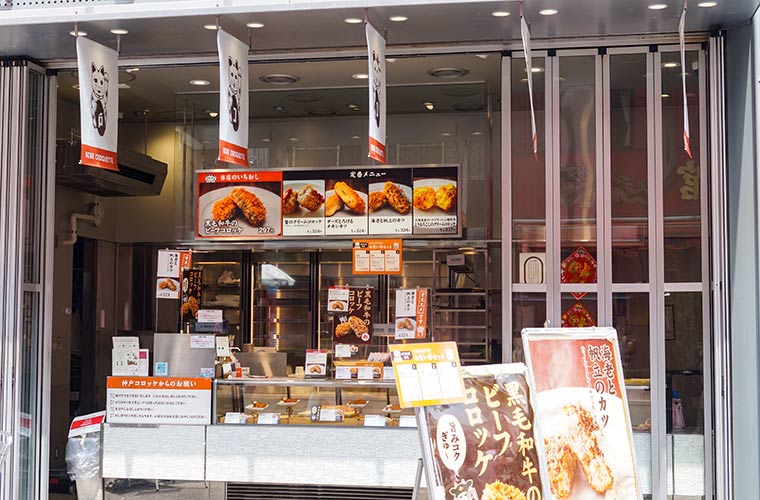 南京町グルメで外せないのが「神戸コロッケ元町本店」のコロッケです。世界的建築家・安藤忠雄氏が手がけたスタイリッシュで洗練された建物と、かわいらしい招き猫の看板を目印に訪れて。