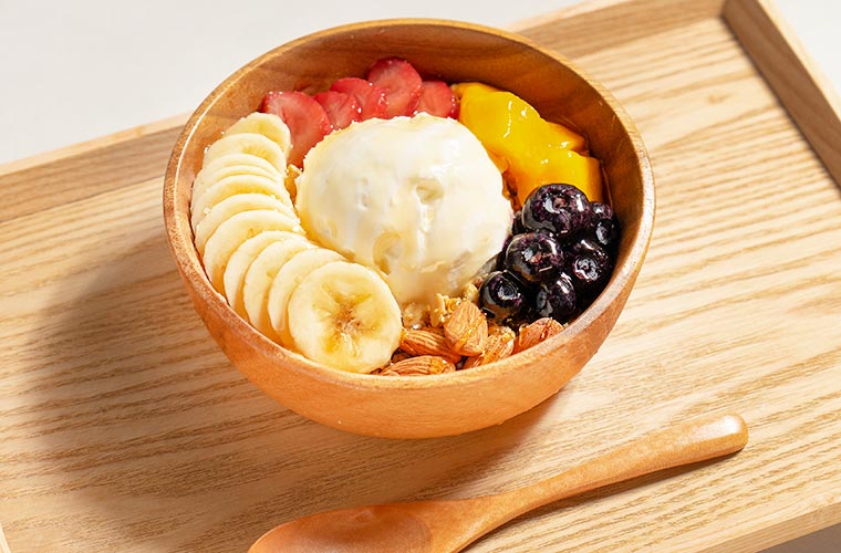 ひんやり冷たく甘酸っぱいアサイーペーストに、軽やかでカリッとした食感のグラノーラがアクセント!さらに食べるごとに、イチゴの爽やかな酸味、バナナの優しい甘み、マンゴーの濃厚な風味、ブルーベリーのジューシーな味わいなど、一口ごとに違った表情が楽しめるのが醍醐味です。