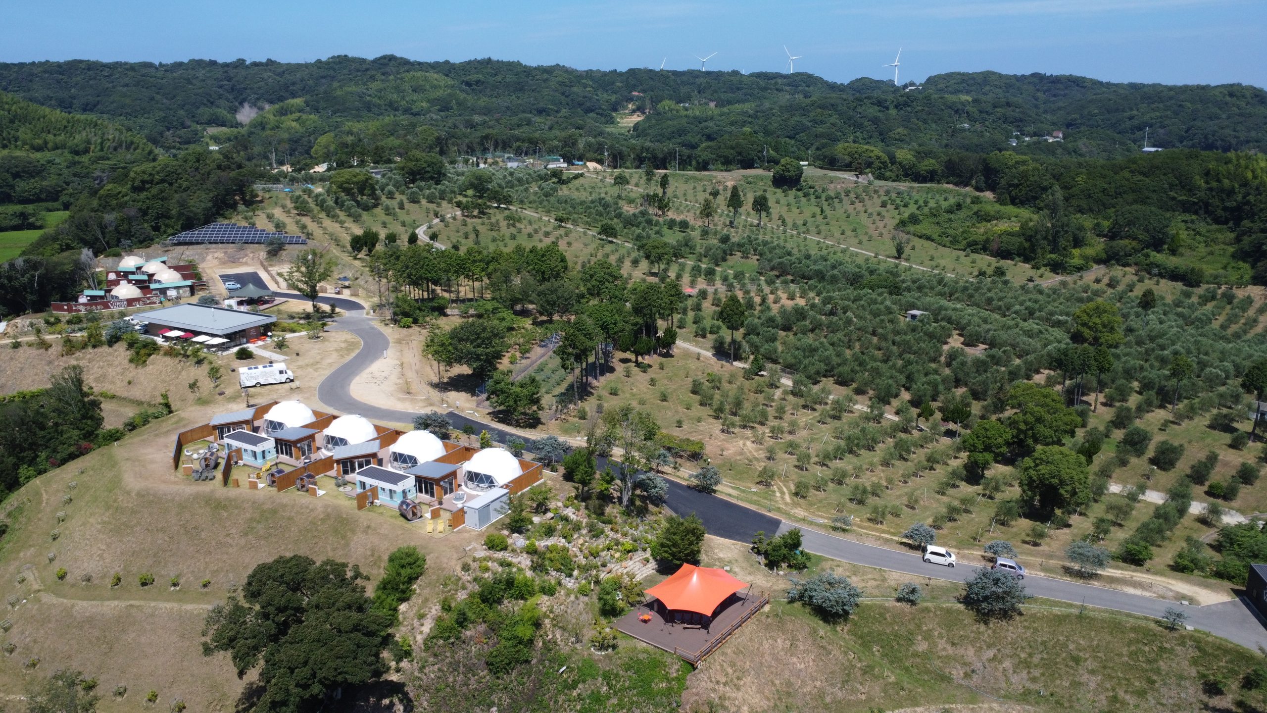 併設のグランピング施設は、絶景のオリーブ畑を見渡せるという眺望の良さから近畿エリアなどの観光客から特に人気です。今や他にはない絶景のオリーブ畑を見渡せるグランピング施設として親しまれていますが、もとは山間部のため人が訪れることが少なく、「山間部の絶景をもっと多くの人に知ってほしい」との思いからここの開拓が始まったそう。