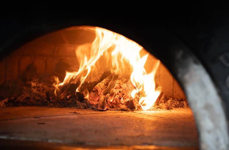 ピザ窯で使う薪は、オリーブ園造成時に伐採した木を乾燥して再利用。薪釜によって高温、短時間で焼き上げることで香ばしさをプラスするだけでなく生地や具材をふんわりと包み込みます。