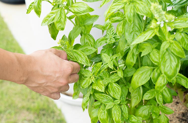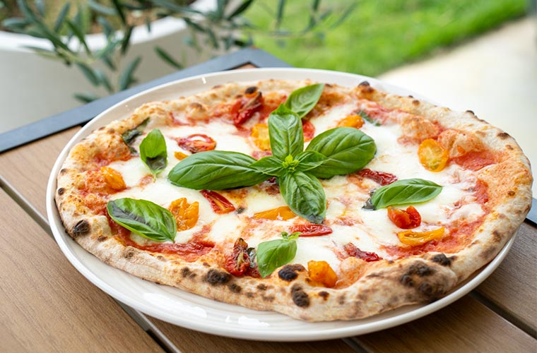 オーダーが入ると、レストラン前の花壇からバジルやローズマリー、マリーゴールドを摘み取ります。収穫したてのハーブは香りが強く、熱々のピザにのせるとふわりと立ち上がる清涼感が食欲を誘います。