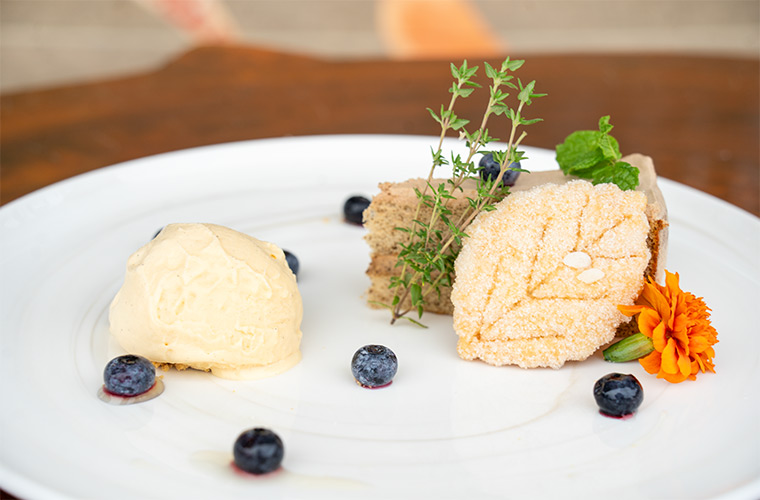 “淡路島の旬”がふんだんに取り入れられたスイーツも、ここに来たら味わいたいところ。おすすめは『“アールグレイ インゼン”紅茶ケーキ〜アイスクリーム添え〜』。世界中で愛されるフランスの紅茶ブランド「ダマンフレール」の茶葉を使った香り高いクリームと、甘酸っぱいイチジクをふんわりジェノワーズで挟んだ上品な一皿です。