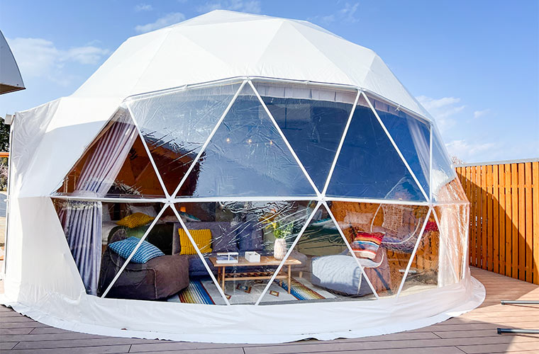 プライベートドッグラン付きのドーム型テントが4棟、海を望むオーシャンビューエリアが4棟がスタンバイ。家族、カップル、友人同士、インバウンド客まで幅広く利用できます。コンセプトは“自然との共生の中にあるラグジュアリー”で、大自然に抱かれながらも快適に過ごせる設計が、ここにしかない魅力を生み出しています。