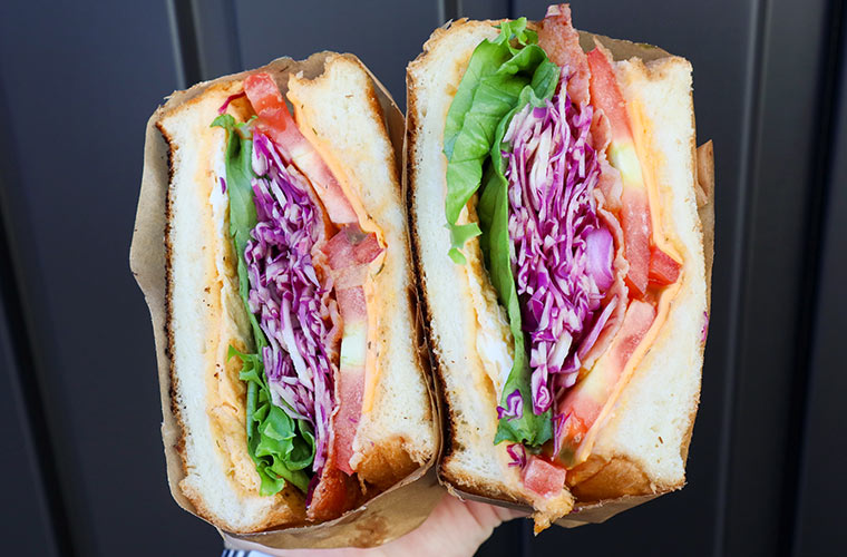 人気No.1は、野菜のシャキシャキ感を楽しめる『BLT』。トーストされてサクッとした食パンに、レッドキャベツ、グリーンリーフ、トマトなど6種類の具材をサンド。一口進めるたびに、みずみずしい野菜のシャキっと食感の中に、食欲をそそるチェダーチーズの香り、塩気の利いたベーコンの香ばしさ、店内で焼いた卵焼きの温かさが広がります。