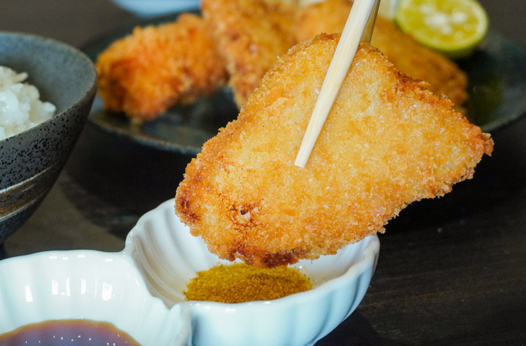 取材日のフライは、サーモン、マグロ、2種の白身魚がラインアップ。とんかつソースかオリジナルのカレーパウダーを付けて召し上がれ!白身魚のフライはぜひカレーでどうぞ。スパイシーなカレーの風味の後にほんのり白身魚の甘みも広がる奥深い味わいが、次の一口を誘います。