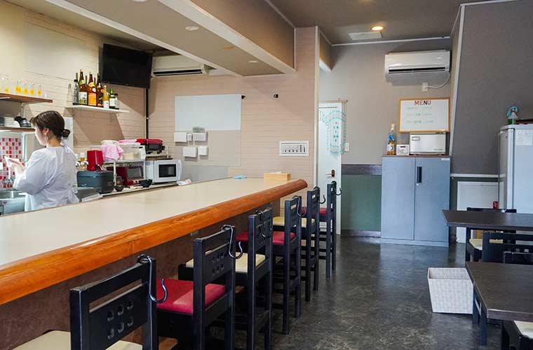 店内は落ち着いた雰囲気で、カウンター席とテーブル席をあわせて15席ほどのこぢんまりとした店内。明るく気さくな店主夫妻との距離もほどよく、会話を楽しみながら食事もゆっくり味わうことができます。