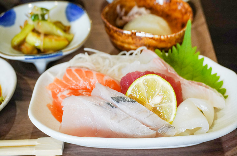 メインとなる刺し身の盛り合わせは、毎朝地元の鮮魚店「マルエ水産」から仕入れた新鮮なネタを使用するのがこだわり。ネタは日によって変わり、脂ののったサーモンやマグロ、前捕れのサワラやハリイカなど、産地にとらわれず“その日おいしいもの”を目利きして仕入れています。