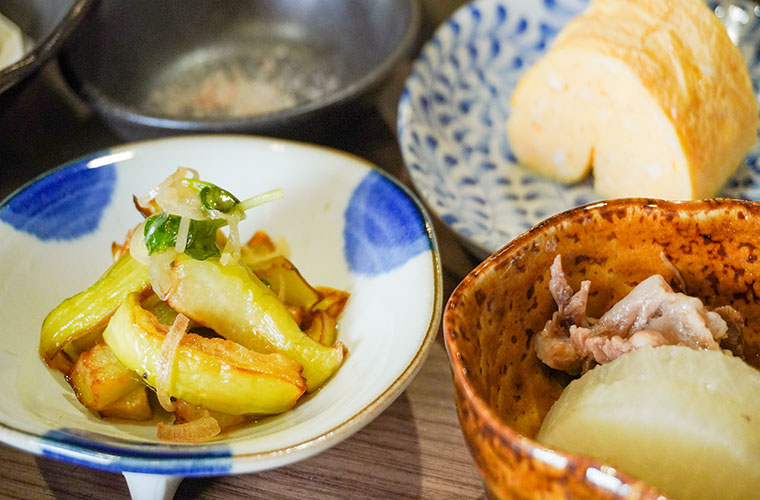 おかずの内容は日によって異なりますが、旬の野菜をふんだんに使った献立が魅力。この日は看板メニューの「だし巻き卵」をはじめ、「揚げナスのミョウガナムル」や「すじ大根」などが並びました。ほっと心がほどけるような優しい味わいの中に、ナムルでアクセントを添えるなど、飽きのこないバランスの取れた一汁多菜のラインアップです。