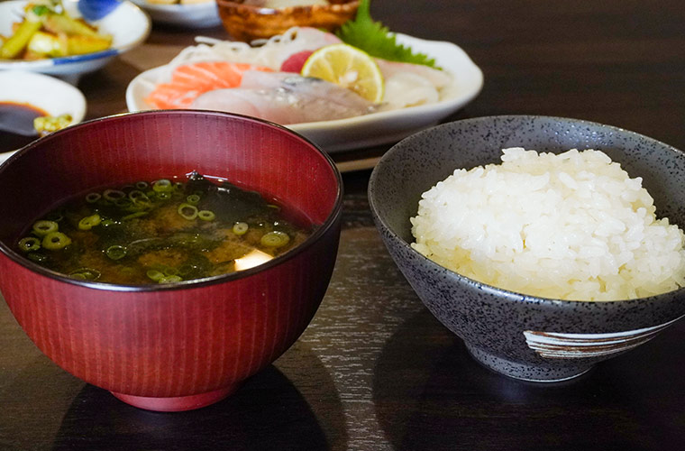 刺し身の味をより引き立てるご飯と味噌汁にも、店主夫妻のこだわりが詰まっています。ご飯には、佐用町の農家から直接仕入れる特別栽培米「さよ姫の雫」を使用。栽培期間中はほとんど農薬を使わず、検査でも残留農薬ゼロを実現したお米なんだとか。ふっくらとした炊き上がりと上品な甘みは、一口で「これだ!」と惚れ込んだという店主夫妻のお墨付き。