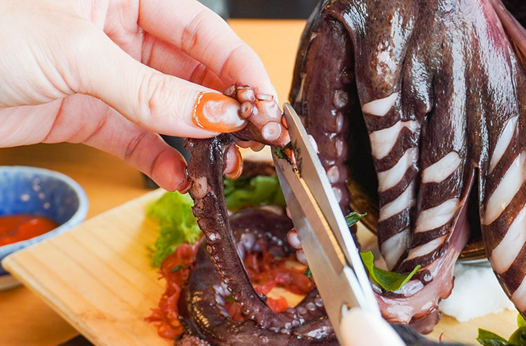 テーブルに運ばれてきたしわら干しのタコの足を、自分の好きな大きさにカットし、刺身を含む全部で8通りの食べ方で楽しめるのが、このメニューの醍醐味です!