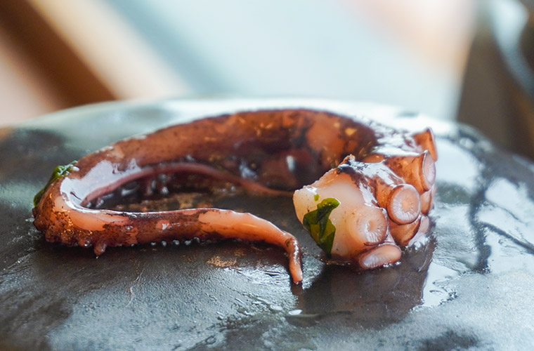 刺身、マリネ、タコチリ、タコ焼きなど、さまざまな食べ方が用意されている中で、料理長のイチオシは炙り。熱々に熱された鉄板の上で軽く炙ることで身がキュッと引き締まり、甘みがぐっとアップします。塩もみで加えた自然な下味があるので、何も付けずに味わうのが、どんな食べ方よりも一番の贅沢です。