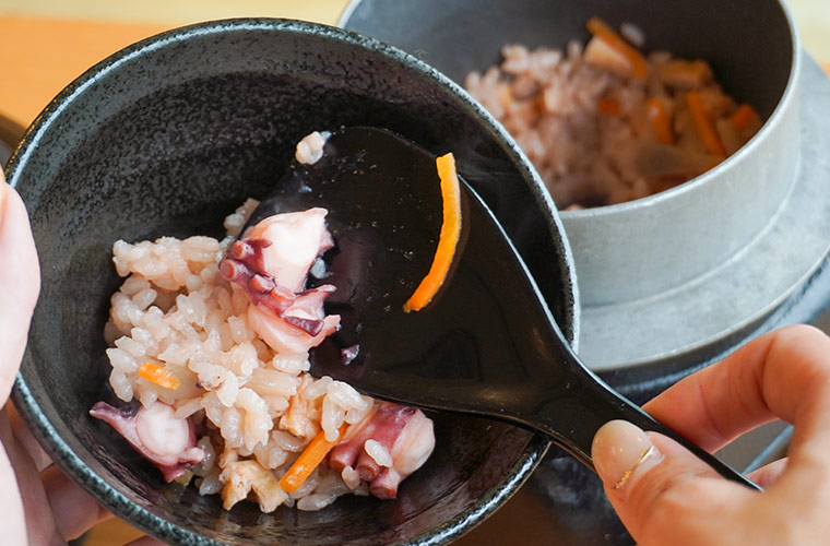 プラス550円で、『たこ瓦めし』または『たこ石めし』をセットにすることもできます。特注の「淡路瓦」を蓋に使った釜めしは、インパクト抜群でSNS映え間違いなし!かつお節とサバ節からとった合わせ出汁をベースに、淡路産タコのうま味がじんわりと染み込みます。一口ごとに広がる出汁の香りと、ふっくらごはんの甘みがたまらない、贅沢な炊き込みご飯で締めくくって♪