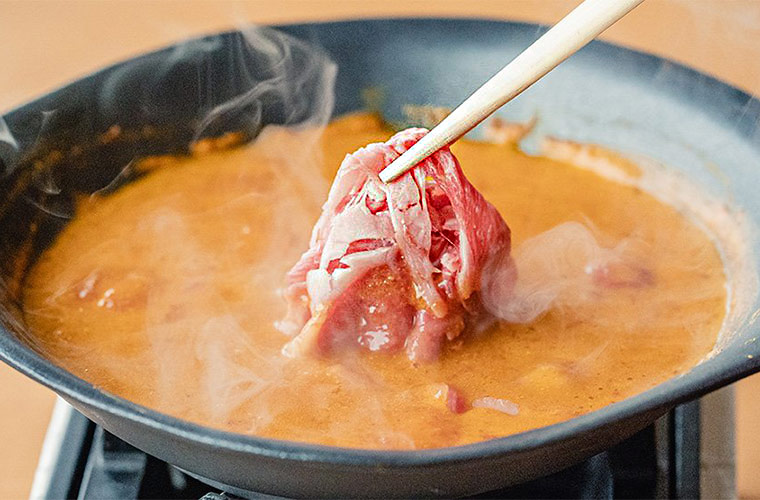淡路島の中でも特に潮の流れが速く、プランクトンやミネラル豊富な南あわじの海で育った赤ウニを使用。ウニのうま味を酒かすや豆乳でのばすことで引き立てたまろやかなスープに、「淡路牛」をくぐらせてパクッと一口。その味わいは、肉の甘みと海の香りがふんわりと重なり合い、思わずため息がこぼれます。