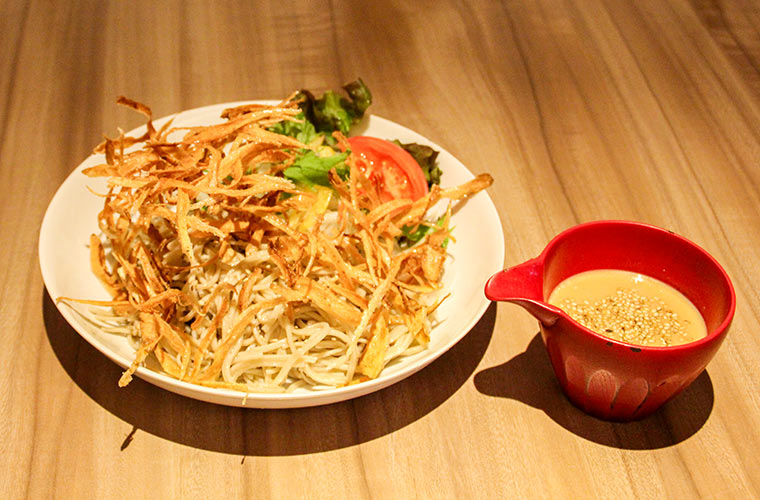冷たいそばの上に素揚げされたゴボウがこんもりとのったそばは、サラダのような感覚でゴマ風味のつゆでいただきます。喉ごしのよいそばと、ゴボウのカリカリとした食感が一度食べるとやみつきに。