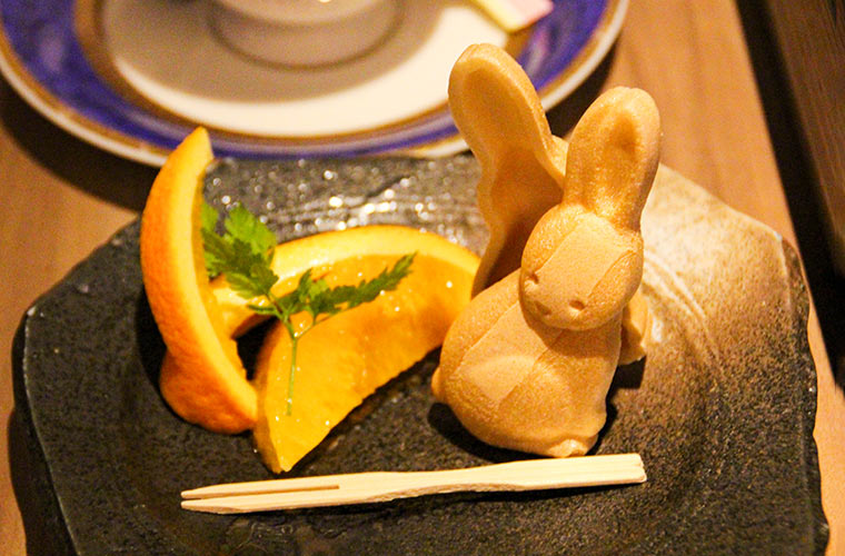 デザートは「ウサギの最中」が登場。ウサギは縁起がいいということから発案されたそう。ウサギの顔がとても愛らしく、見ても食べても心が和む一皿です。