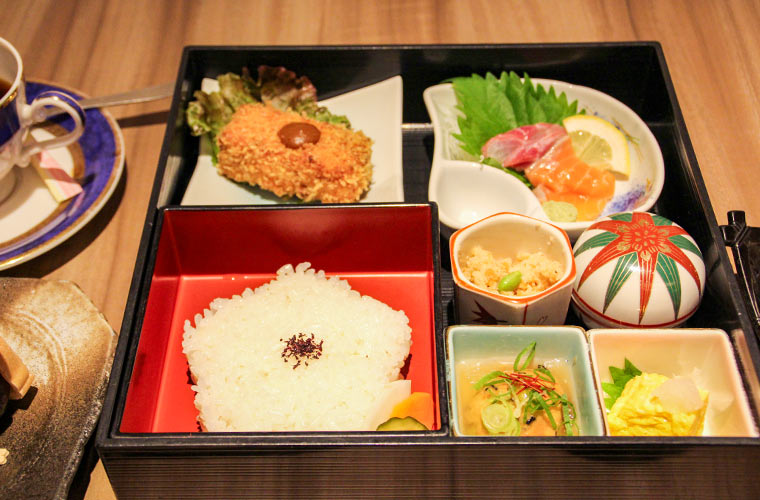松花堂弁当は日替わりで、取材時は「自家製キノコクリームコロッケ」「本マグロナムル」「おから」「だし巻き卵」「手作りひろうす」と、これだけでもお腹いっぱいになれそうな“和のおかず”が満載の一箱です。小鉢の料理はどれをとっても上品な味付けで、優しい和の味わいが楽しめます。