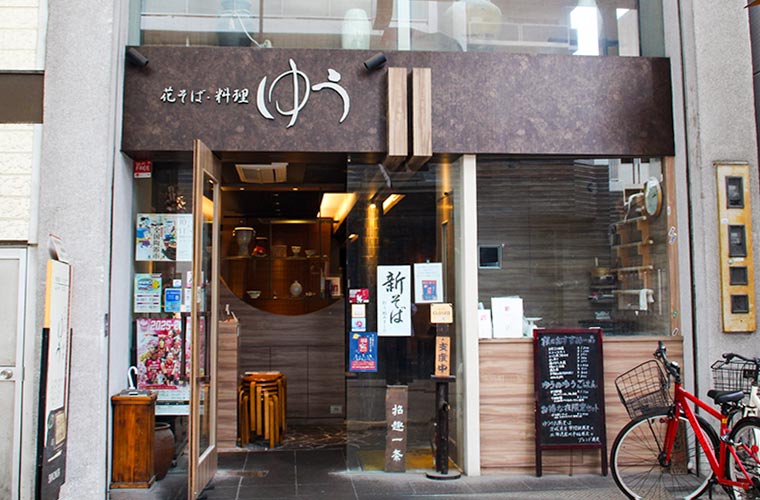 JR山陽姫路駅から「姫路城」に向かって歩くこと約10分。左側に開けた「西二階町商店街」の、のどかなアーケードをさらに歩くと、手打ちそば専門店「花そば・料理 ゆう」があります。もともと100年続く和装小物店だった店舗を、17年前に店主が引き継ぎ、次の時代を見据え、「和」というものを末永く楽しんでもらおうと、手打ちそば専門店をはじめたそう。