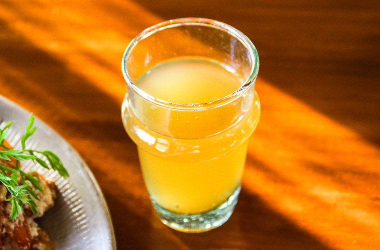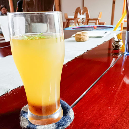 「ななつぼし定食」はちょっぴりコース仕立てになっていて、食前の手作り酵素ドリンクからスタートします。酵素ドリンクは、自然栽培の果実ときび砂糖がベースで、取材時はレモン風味でした。レモンの爽やかな風味が生きた飲みやすい味わいで、飲むだけで身も心もリフレッシュできる一杯です。