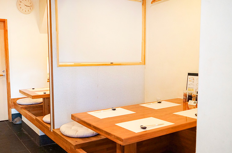 席は、靴を脱いでくつろげる掘りごたつ式の4人掛けテーブルが2卓。足を伸ばしてゆったりと過ごせるので、まるで我が家に帰ってきたような安心感にホッと一息。