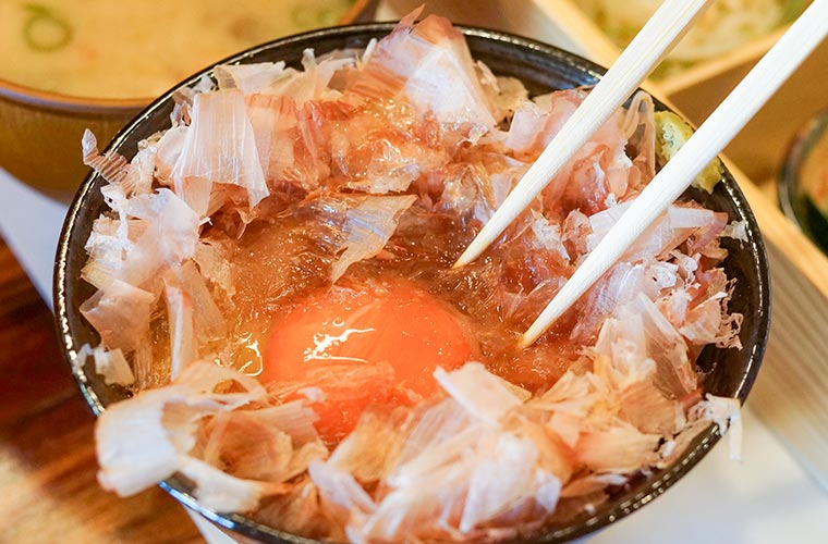 鰹節は、鹿児島県産のものを「金物のまち」として知られる三木市の削り器で、店内で丁寧に削っています。削りたての鰹節ならではの豊かな風味と濃厚な卵がご飯と絡み合い、口いっぱいにうま味が広がります。さらに、添えられたワサビが、味に心地よいアクセントをプラス。