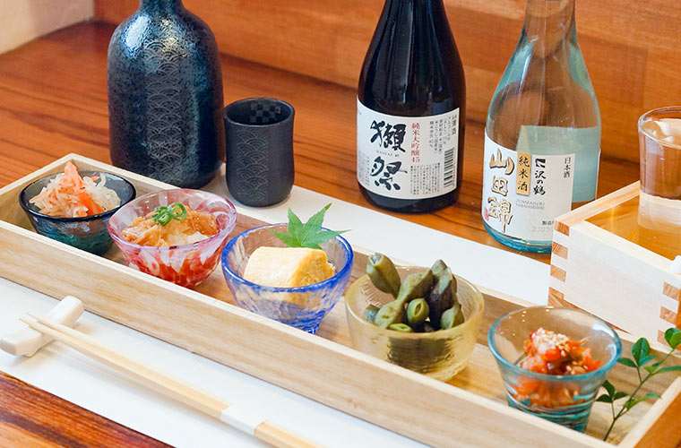 この日のおつまみは「キムチ」や「だし巻き」、「きんぴらごぼう」など。どれもお酒が進むおいしさで、津軽びいどろの器の色合いが夜の時間を一層華やかに彩ります。美しい器とおいしい料理に癒やされ、つい長居してしまいそう。