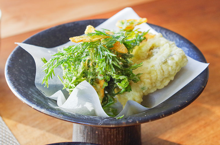 旬の作物はもちろん、育てる過程で間引かれた若ニンジンの葉を使った天ぷらなど、畑の“いま”を味わえるのも魅力。そのサクサクと軽やかな食感の後に広がる爽やかな甘みは、自家農園ならではのおいしさです。
