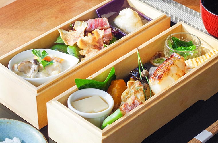 同店の看板メニューは、2段のお重に10種類以上もの料理を詰めた『さくら重』。木でできたお重のふたを開けると華やかに広がる季節の色は、思わず感嘆の声がもれてしまうほどの美しさ。