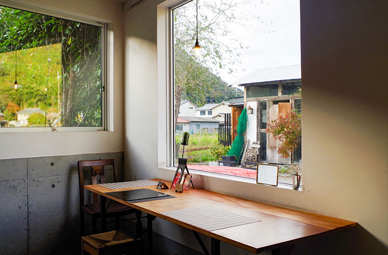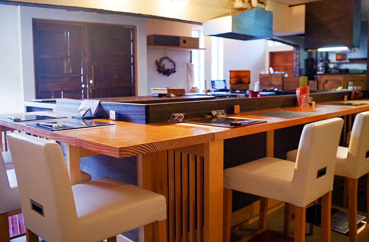 手前には陽の光をたっぷりと取り込む大きな窓と開放的なオープンキッチンが広がり、奥にはキッチンを眺められるカウンター席と、ゆったりとしたテーブル席があります。窓から穏やかな景色を眺めたり、カウンター越しに料理長の手さばきを楽しんだり、奥の席で大切な人とくつろいだり。思い思いのひとときを過ごしてみて。