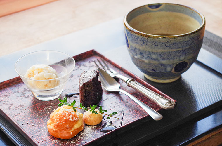 『さくら重』を満喫した後には、手作りのスイーツセットもおすすめです。どんなスイーツと出合えるかは来店してからのお楽しみ。取材日のスイーツは「いちじくのアイス」「シュークリーム」「ガトーショコラ」の3品でした。