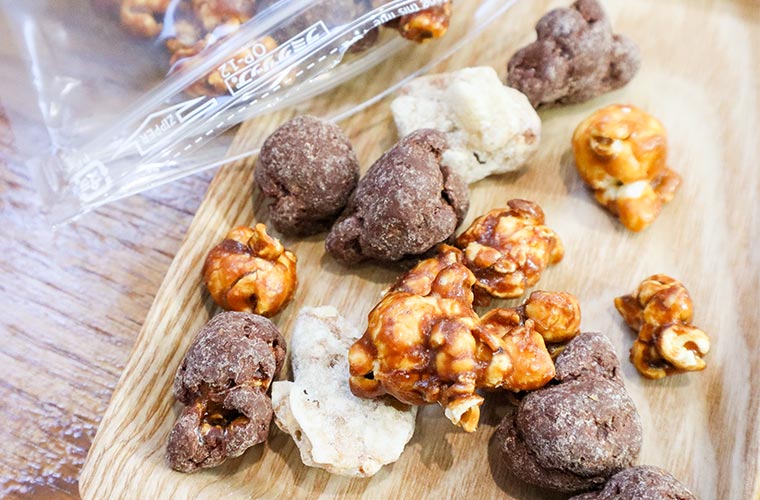 無添加ポップコーンを使った『醤油キャラメルポップコーン&ショコラ』は、「醤油キャラメルポップコーン」、「ショコラポップコーン」、「くるみの糖衣がけ」の3種の味が楽しめます。