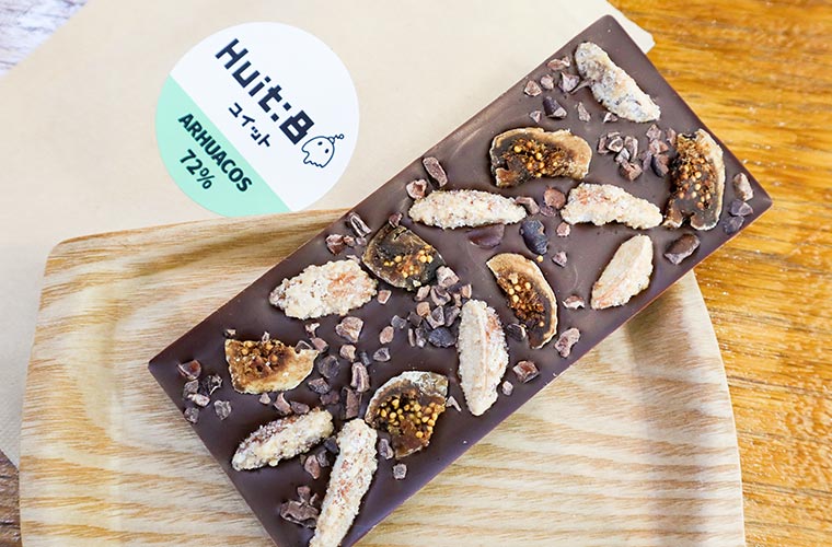チョコの上には、オーガニックアーモンドキャラメリゼ、オーガニックドライ白イチジク、オーガニックカカオニブの3種類が彩りを添えるようにトッピングされています。