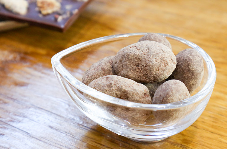 オーガニックアーモンド、キャラメル、チョコレートを重ねた贅沢な一粒である『アマンドショコラ53%』。アーモンドの香ばしさ、オーガニックグラニュー糖をキャラメル化したしっとりとした甘み、「トゥマコレチェ53%」の柔らかい甘みが見事に調和しています。カカオのビターさが苦手な人にも食べやすい、大人な味わいです。