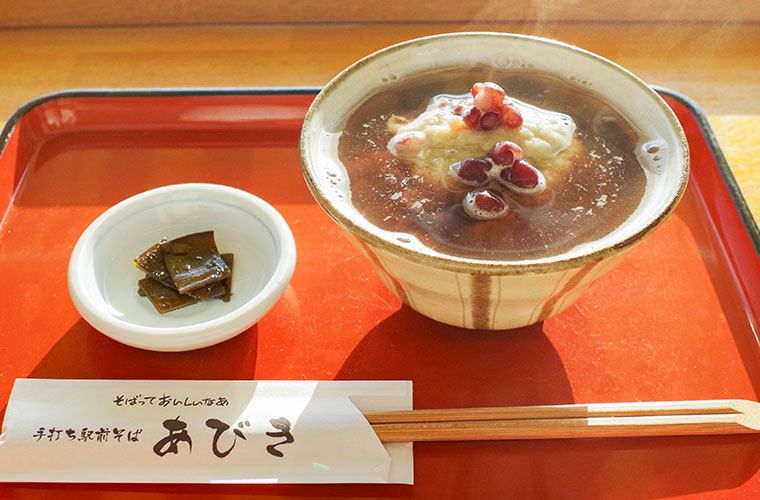 食後には、そばを使った甘味はいかが?『そばがきぜんざい』は、そば粉を水で溶き火にかけて練って作るそばがきに、甘く煮た小豆を合わせた、食事の〆におすすめの一品。