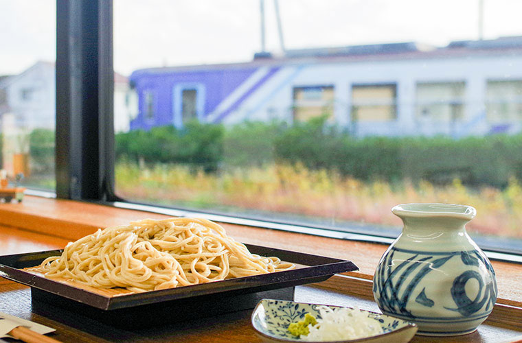 北条鉄道活性化事業の一環として生まれた同店。大きく切り取られた窓からは、線路がすぐそこに見え、運が良ければ北条鉄道の通過にも立ち会えます。遠景には網引町の山々、周囲には桜や銀杏の木など、季節ごとに移ろう自然を眺めながらそばを楽しめるのも魅力。