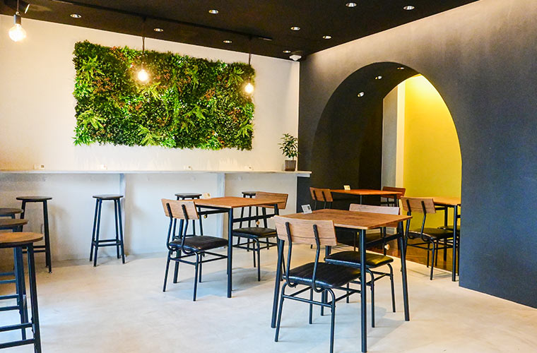 店内は南向きの窓からやわらかな光が差し込み、グリーンをプラスした心地よい空間。カジュアルさの中に和のエッセンスを散りばめ、和と洋が自然に溶け合うモダンな雰囲気に仕上げられています。