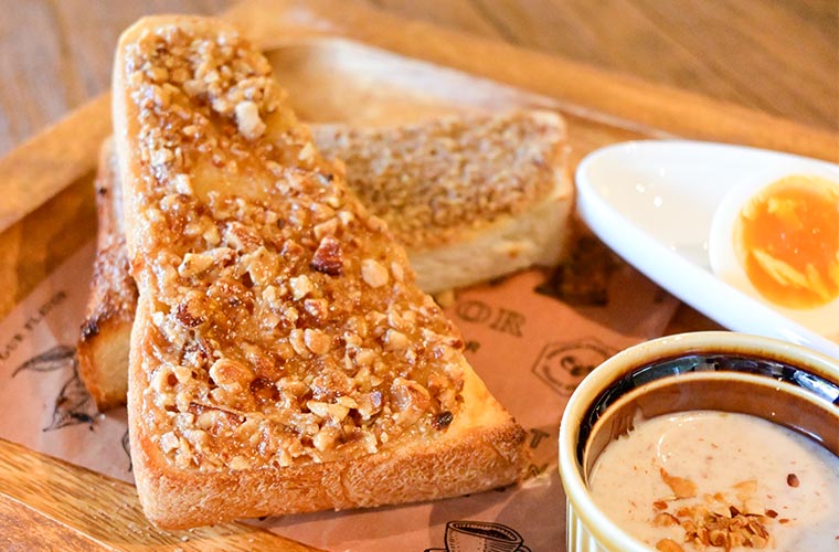 アーモンドバタートーストは、単品(750円)でも注文可能。1/2サイズでテイクアウト(400円)もできるので、シーンに合せて利用してみて。