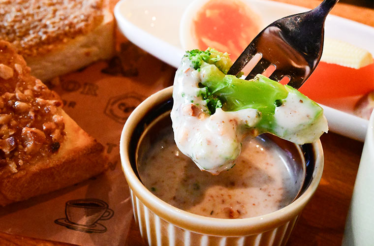 バーニャフレイダは、アンチョビなどをブレンドしたバーニャカウダソースにアーモンドを加えた冷製仕立て。まろやかさの中にほんのり酸味が利き、野菜の甘みを引き立ててくれる一品です。