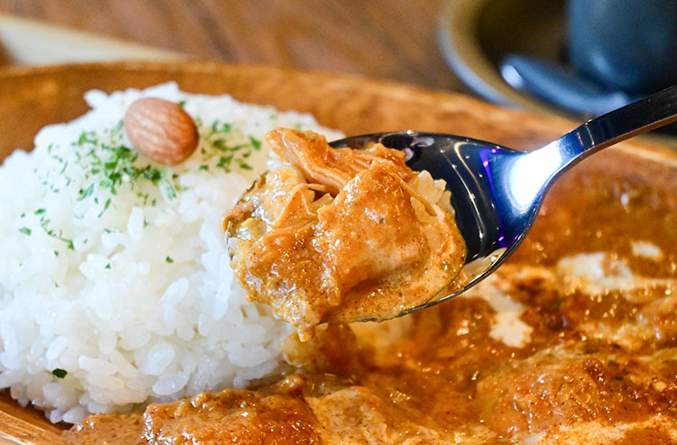 スプーンを入れるだけでほろほろとほどけるチキンも魅力の一つ。まずはそのまま頬張り、途中からデュカをカレーに混ぜて辛さや香りを好みに調整するのもおすすめです。一皿で味の変化を楽しめます。